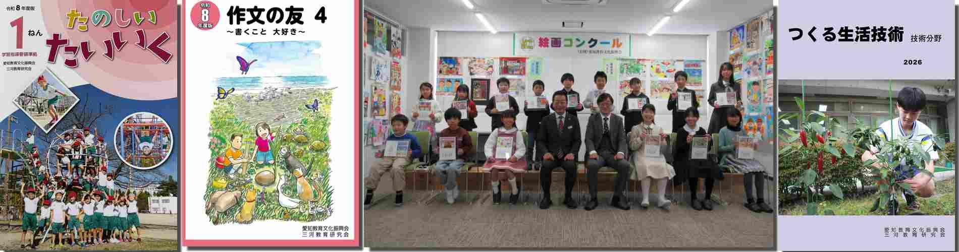 モニターBOX 刊行物を実際に使った方(教職員・保護者・児童生徒)の感想やご意見をお待ちしています。 小学校刊行物 「ことばのきまり」「修学旅行のしおり」など小学校教育で使用していただく刊行物をご紹介します。 中学校刊行物 中学校向け「ことばのきまり」「表現の友」などの刊行物をご紹介します。 教育情報誌 「教育と文化」 愛知・三河の教育と文化について語ります。 新着情報 教室の窓辺 碧南市立東中学校2026年2月27日三河の小中学校...Read More日本画家 村松乙彦2026年2月27日三河の文化を訪ねて,三河ビュー...Read More教育と文化№140をアップしました2026年2月27日その他教育と文化№140...Read More令和7年度「みかわ彩発見絵画コンクール」表彰式2026年2月27日各種事業...Read More令和7年度「かきぞめコンクール」作品展・表彰式2026年2月13日各種事業...Read More2月8日(日)に予定している「かきぞめ・絵画コンクール表彰式」は、予定通り開催します。寒い日が予想されますので、気をつけてお越しください。なお、都合により、出席できなくなった場合は、愛知教育文化振興会(0564-51-4819)までご一報ください。2026年2月6日システム...Read More
